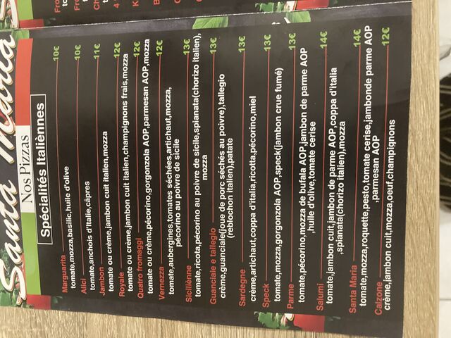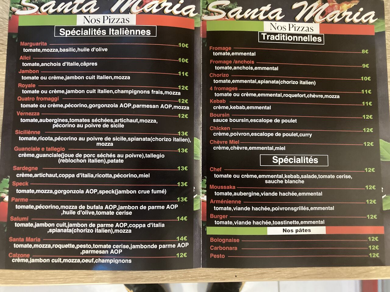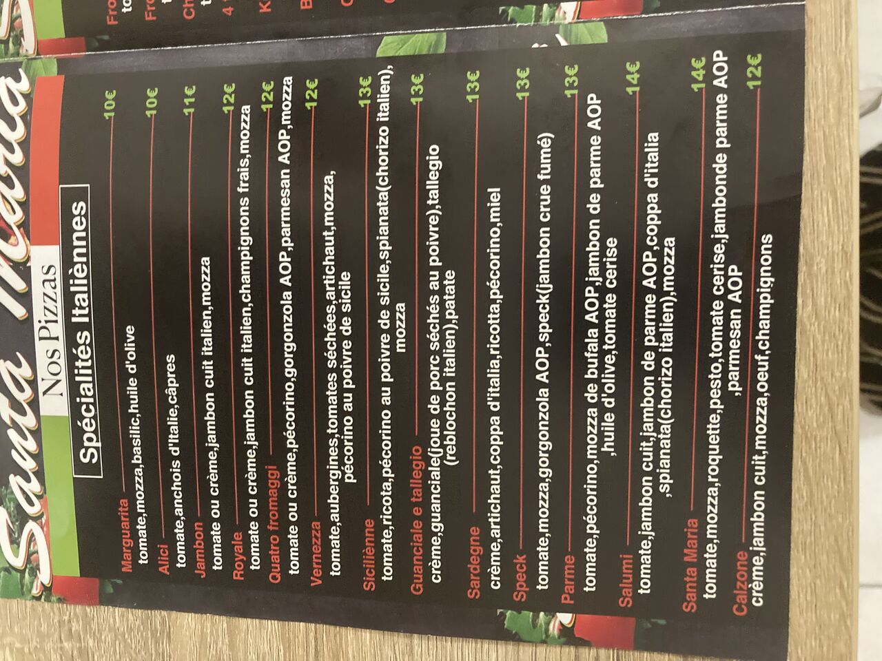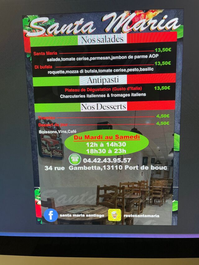 CALL +330442439557Santa Maria est un restaurant pizzeria avec des produits italiens de qualités charcuteries fromages et bien sûr le basilic huile d’olive pour confectionner de délicieuses pizzas pâtes et salades